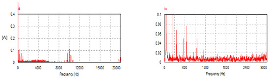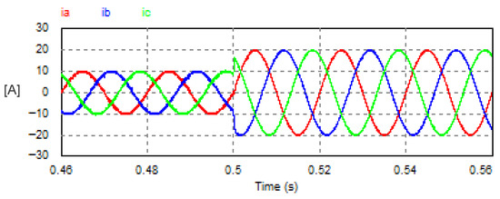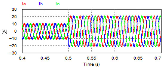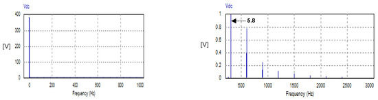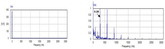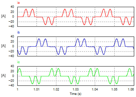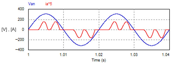 In this mode, the USMR operates under ON–OFF current control of the AC currents. The AC grid currents are controlled to the desired peak value (20 A). The actual grid currents and the resultant load voltage are plotted at a steady state. The corresponding harmonic spectra are presented as well. Owing to the results, the grid currents are well controlled to the desired value, as illustrated in Figure 8. The THD of the AC current is 1.07%, which meets the standards. The harmonic spectrum of the AC current (ia) is presented in Figure 9. The spectrum contains the 1st harmonic at 50 Hz with an amplitude of 20 A (see LHS graph of Figure 9). The spectrum contains odd harmonic orders (5, 7, 11, 13, 17, 19, 23, 25, etc.) with relatively small amplitudes of less than 0.25% of the fundamental component) (see RHS graph of Figure 9). Moreover, the input PF is 0.999.