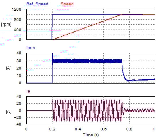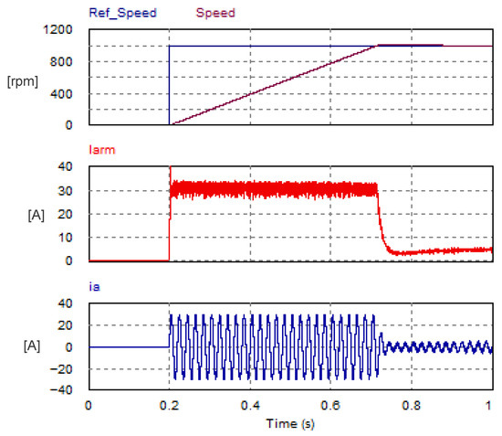 If is chosen to be 0.5 s, then will be 11.42 rad/s. Hence, the gains and will be 1.13 and 10.25, respectively. In fact, the previous method of determining (computing) the gains of the PI speed controller is considered a good initial estimate and has led to satisfactory speed response. Extra improvement can be achieved by fine-tuning the gains either by applying any evolutionary search algorithms to achieve a satisfactory transient response or by autotuning in Simulink/Matlab®R2017.a. The overall USMR system has been studied using the PSIM® 9.1 simulation tool, which is customized to simulate power electronics and motor drive systems. The simulation parameters are summarized in Table 2.