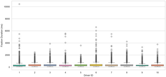 In contrast, the maximum fixation durations differ substantially between drivers, ranging from 2467 ms (Driver 2) to 10,433 ms (Driver 1). These extended fixations likely reflect situational perceptual demands, momentary lapses in scanning behaviour, or specific environmental stimuli that require prolonged visual attention. Drivers 1, 4, 6, 7, and 8 exhibit particularly high upper extremes (>4000 ms), indicating episodes of markedly sustained gaze.