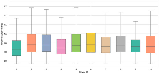 Short fixations show remarkable uniformity across all drivers, with the minimum duration consistently around 69–70 ms, representing the lower perceptual threshold of recorded fixations. The interquartile ranges (IQRs) are also stable, with q1 values between 165 and 210 ms and q3 values between 360 and 456 ms, demonstrating comparable dispersion in the central portion of the distribution across participants.