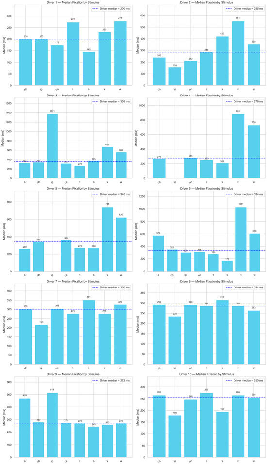 Across drivers, fixation durations exhibit considerable variability, as shown in Table 1. Mean fixation times range from approximately 323 ms (Driver 9) to 398 ms (Driver 6), reflecting moderate inter-individual differences in gaze allocation strategies. The median fixation durations fall within a narrower interval (270–295 ms for most drivers), suggesting that typical fixation behaviour is relatively consistent, with divergence mainly driven by longer, less frequent fixations. This interpretation is supported by the asymmetry between means and medians, indicating right-skewed distributions with occasional long-duration fixations that elevate the mean.