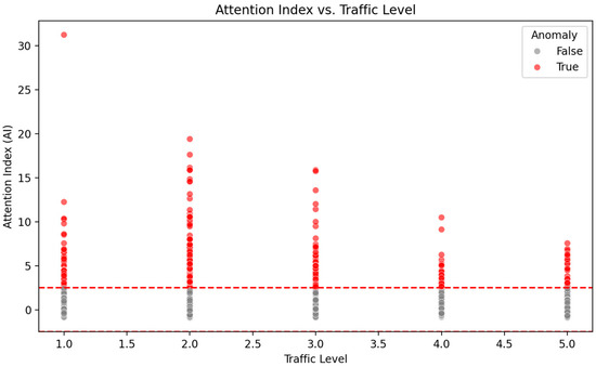To determine an appropriate value for the traffic-normalisation coefficient β, we performed a data-driven sensitivity analysis across five candidate values (β ∈ {0.00, 0.05, 0.10, 0.15, 0.20}). For each value, fixation durations were normalised according to (Equation (2)) and the full DSGP pipeline was executed to compute anomaly rates. A bootstrap procedure was applied to estimate 95% confidence intervals and to quantify model stability. The results showed that anomaly rates were extremely stable across all β values, differing by less than 0.0005, but model distortion increased monotonically with larger β; see Table A1. The lowest error and most stable confidence intervals occurred for β in the range 0.00–0.10, with β = 0.00 yielding the best overall performance. Based on this analysis, β = 0.00 was selected as the optimal and most parsimonious setting for the final DSGP implementation. The anomaly rate remained extremely stable across all β values, with a maximum absolute difference of only 0.00049. Importantly, the lowest reconstruction error and tightest confidence intervals were observed for β ∈ [0.00, 0.10], after which performance worsened slightly.