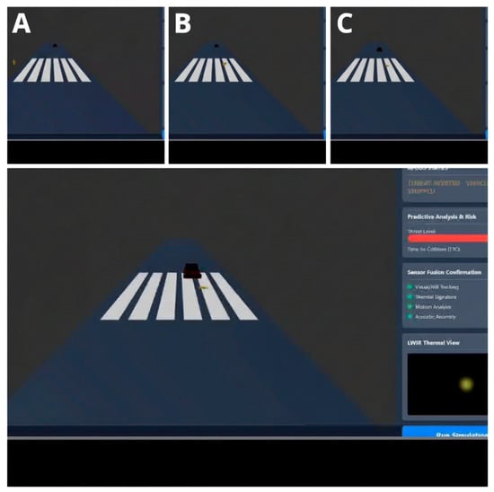 This composite image, extracted from Supplementary Video S1, illustrates the system’s progression through three critical phases: (A) Initial state, (B) Predictive detection and escalation to CRITICAL threat, and (C) Final state of safe vehicle stop (THREAT AVERTED).