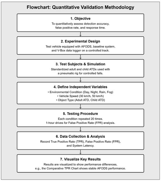 Although the AFODS architecture provides full vehicle coverage with front and rear sensors, the forward-facing system is used for the validation trials detailed in this study to establish a performance benchmark. Regarding the experimental condition, a test vehicle is equipped with the full AFODS, the baseline system and a V-Box data logger for ground truth measurements. A controlled test track is used for testing. As the subjects, a standardised test ATD, a 50th percentile male anthropomorphic test device (ATD) and a 6-year-old child ATD are used. A pneumatic rig is used to induce controlled, repeatable falls. For the independent variables, the environmental condition is clear daylight, night (0 lux), simulated rain (50 mm/h) or simulated fog (visibility < 50 m); vehicle speed is 30 km/h or 50 km/h; and object type is adult ATD or child ATD.