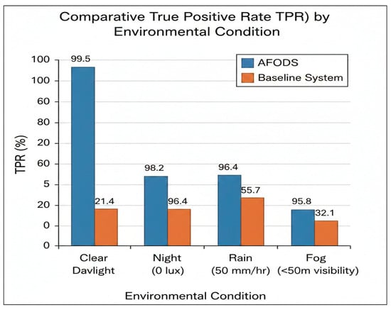 Comparative True Positive Rate (TPR) by environmental condition for AFODS and the baseline system.