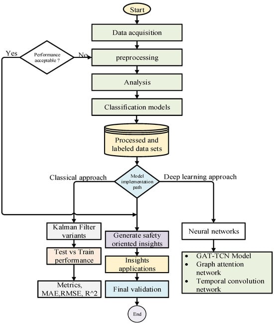 Data collection and an iterative preparation phase to guarantee data quality are the first steps in this research’s organized methodology. Analysis and the production of processed, labeled datasets come next. In order to capture intricate spatiotemporal patterns, the fundamental investigative method is comparative, utilizing both a deep learning approach using neural networks and a novel GAT-TCN (Graph Attention Network-Temporal Convolutional Network) model, as well as a classical method using temperature gain models and Kalman filter variants. To guarantee generalizability, test vs. training comparisons are used to thoroughly assess model performance, and important metrics like as MAE, RMSE, and R2 are used to quantify insights. In order to provide a strong predictive maintenance solution, the process ends with final validation, where the results are combined to produce safety-oriented insights for real-world application is shown in Figure 1. Current research develop a hybrid GAT-TCN framework to enhance traffic state estimation under the constrained data conditions typical of rural arterials. The model is explicitly designed to integrate heterogeneous data sources, such as loop detector and Bluetooth data, to compensate for sparse sensor coverage and data inconsistencies. By jointly learning from these fused spatiotemporal data, the model provides a more robust estimation of network-wide traffic states. Furthermore, this estimation output is specifically leveraged to facilitate the identification and prediction of safety-critical phenomena.