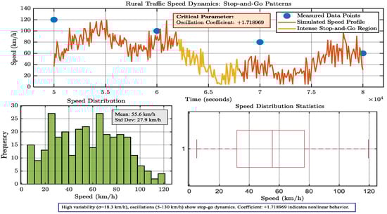 In Figure 5, In order to quantify oscillatory behavior, empirical observations were compared to a generated velocity profile in order to understand traffic speed dynamics. The Oscillation Coefficient (+1.718969), a crucial statistic for describing the size of non-linear oscillations, was calculated; high values suggest noticeable stop-and-go dynamics. Statistical characteristics validated the analysis: a boxplot verified positive skewness and a high interquartile range, confirming the occurrence of congested, unstable flow conditions, while a histogram showed a broad speed distribution (μ = 55.6 km/h, σ = 27.9 km/h). This combined method offers a mathematical framework for evaluating traffic instability and checks the simulation against actual data.