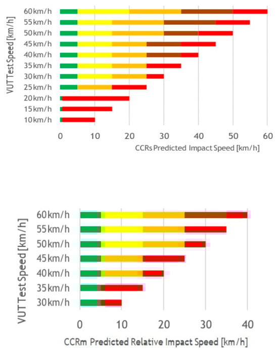 In the described tests, the highest score is awarded to those car models whose automatic emergency braking systems can avoid a collision under test conditions or significantly reduce the consequences of an accident. At the same time, it should be borne in mind that the AEB is auxiliary, and the driver bears full responsibility for traffic safety. In more complex situations, the AEB may not be effective enough, or it may be triggered lately and will not completely avoid an accident, but the impact velocity can be significantly reduced. Effective protection of passengers remains critical to prevent serious accident consequences. At low speeds, when testing with a stationary target vehicle, only the operation of the automatic braking function is evaluated. This is because the test scenario simulates a common urban situation where a driver may be inattentive and fail to notice a stationary vehicle ahead until it is too late. In such cases, the system prioritizes immediate automatic braking over a driver warning, as any delay in deceleration could result in a collision that could otherwise be avoided [9].