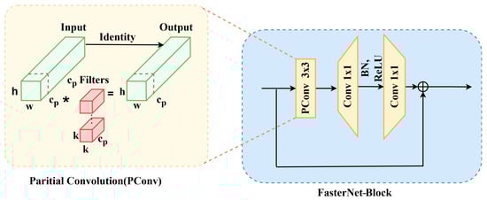 Structure of the FasterNet-Block using Partial Convolution (PConv) for efficient feature extraction. This design reduces computational cost while maintaining strong feature representation capability.