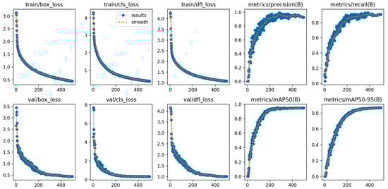 To evaluate the optimization dynamics and stability of the proposed DSGF-YOLO model, Figure 4 illustrates the training and validation curves over 500 epochs. The results demonstrate consistent convergence across all loss components. In particular, the box loss, classification loss, and distribution focal loss steadily decrease throughout training, with both training and validation losses showing strong consistency, suggesting the absence of overfitting. At the same time, the performance metrics such as precision, recall, mAP50, and mAP50-95 improve continuously and stabilize at high values in the later epochs. Notably, recall and mAP50-95 approach saturation, indicating that the model generalizes reliably across diverse accident scenarios.