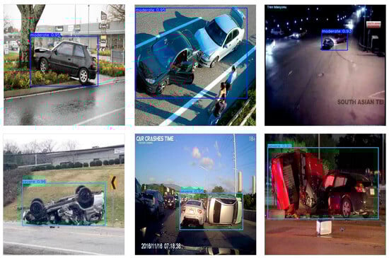 Building upon the convergence analysis in Figure 4, additional qualitative experiments were conducted to assess the practical effectiveness of DSGF-YOLO in real-world traffic accident detection and severity classification. Although the convergence curves indicate stable optimization and reliable generalization during training, it is equally important to examine whether these quantitative improvements are reflected in robust performance under diverse operational conditions. To this end, visual inspection of detection outcomes was carried out on challenging accident scenarios, enabling a more comprehensive evaluation of the model’s strengths and limitations in environments that closely approximate practical deployment.