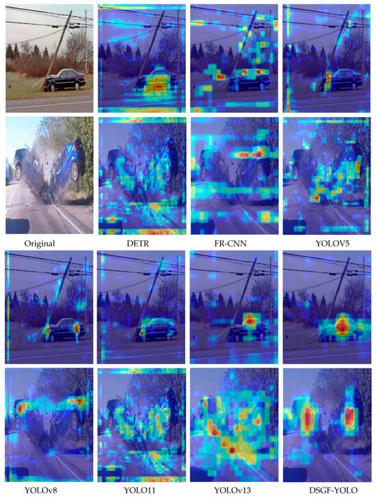 Taken together, the results in Figure 5 demonstrate that DSGF-YOLO not only surpasses existing detectors in quantitative metrics but also provides reliable and interpretable predictions in real-world applications. By integrating enhanced backbone and neck modules, the model simultaneously leverages global contextual reasoning and fine-grained feature extraction, ensuring robust detection across diverse environmental and traffic conditions. This capability is particularly valuable for real-time accident monitoring, where accurate accident identification and severity classification are critical for minimizing response delays and improving traffic safety. To further explore the interpretability and internal decision-making process of the model, Figure 6 presents a visualization comparison between mainstream detectors and DSGF-YOLO using Gradient-weighted Class Activation Mapping (Grad-CAM), a technique that highlights the image regions most influential to the model’s predictions.