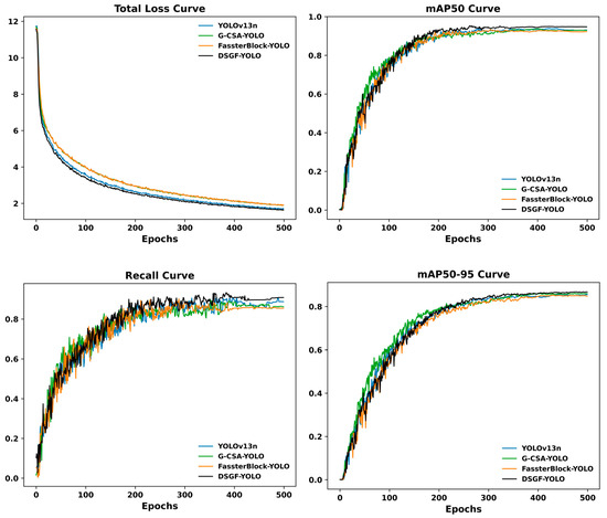 To provide a more comprehensive perspective, Figure 7 depicts the convergence behavior of different YOLO variants during training, including YOLOv13n (baseline model), G-CSA-YOLO (YOLOv13n enhanced with the Global Channel–Spatial Attention module), FasterBlock-YOLO (YOLOv13n enhanced with the FasterBlock module), and DSGF-YOLO (YOLOv13n with both modules integrated). The curves illustrate the reduction in losses together with the progression of recall and mAP values over 500 epochs. Models incorporating either G-CSA or FasterBlock converge more rapidly and achieve higher recall and mAP compared with the baseline YOLOv13n. The complete DSGF-YOLO configuration consistently demonstrates superior performance throughout training, reflecting the synergistic advantages of combining both modules. As shown in Figure 7, this integration not only accelerates optimization but also yields the most stable and reliable detection outcomes.