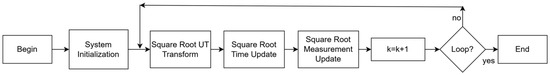 To further improve the accuracy and robustness of the UKF, enhancements were made, resulting in the development of the Square Root Unscented Kalman Filter (SR-UKF) [30,31]. The process is shown in Figure 3, with the following key improvements applied to the estimator:
