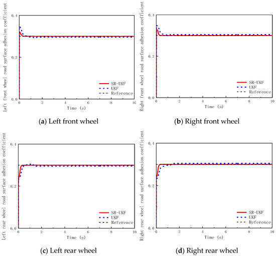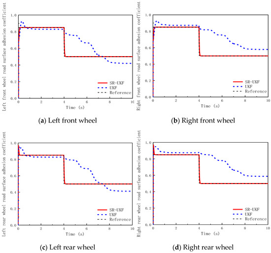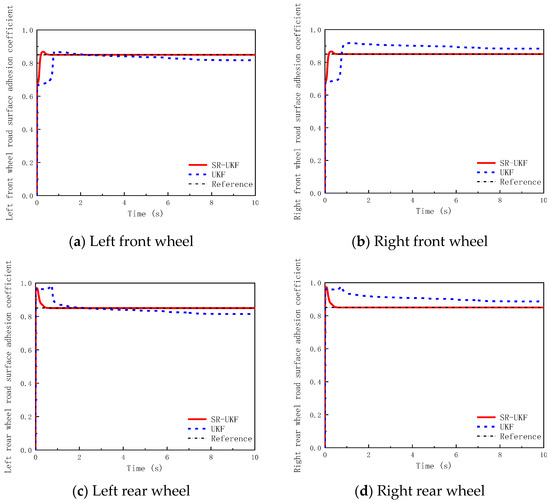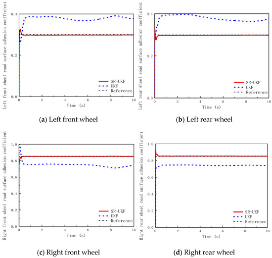 During the simulation, the left road surface adhesion coefficient was set to 0.3 and the right to 0.85. The vehicle traveled in a straight line at 40 km/h with the steering wheel at a 0° angle. The simulation results are shown in Figure 7. The SR-UKF algorithm quickly converged the estimated values of the left and right wheels to their actual values with high accuracy. In contrast, the UKF algorithm showed significant fluctuations in its estimated curves and failed to maintain stable tracking of the actual values over time. As shown in Table 5, the mean absolute error of the SR-UKF (0.0037) is much lower than that of the UKF (0.0924), indicating an estimated reduction in error of about 96%. This clearly demonstrates its superior adaptability under open-road conditions.