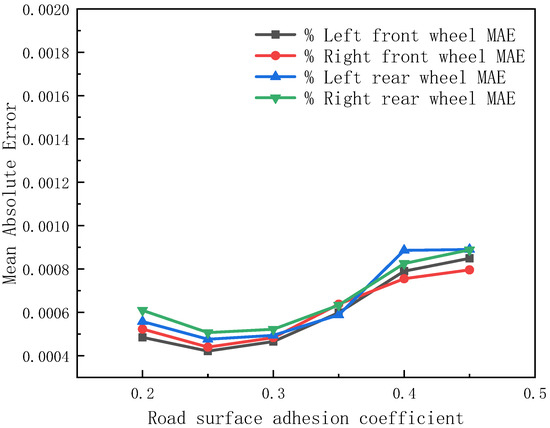 Low-coefficient-of-adhesion road surfaces are typical conditions that cause vehicle dynamic instability, with tire–road interactions showing clear nonlinearity. To systematically explore these effects, this study simulated multiple low-adhesion surfaces with coefficients of 0.2, 0.25, 0.3, 0.35, 0.4, and 0.45. During the simulation, the vehicle traveled at a steady 40 km/h in a straight line, with the steering wheel fixed at 0°. As shown in Figure 9, the mean absolute error (MAE) for the left front wheel, right front wheel, left rear wheel, and right rear wheel stays low under these low-adhesion conditions. The parameters in Table 7 show small error fluctuations for each wheel, indicating that this algorithm provides high accuracy and robustness in estimating the four-wheel system on low-adhesion road surfaces.