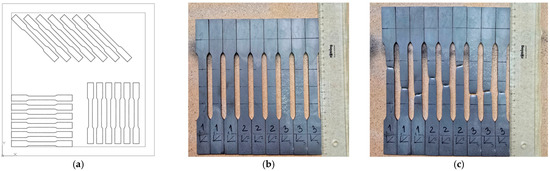 From the actual blanks used in the manufacturing process, a series of samples was extracted. As the blank’s rolling direction is unknown, the specimens were extracted according to the configuration shown in Figure 4a. Figure 4b presents the set of samples prepared, while Figure 4c presents the results of the tensile tests.