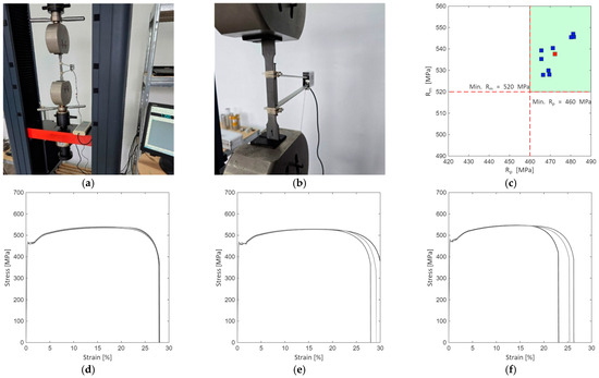 Testing of samples: (a) universal testing machine; (b) extensometer fitted on the sample; (c) collection of and ; (d) engineering stress-strain curves for set 1; (e) engineering stress-strain curves for set 2; (f) engineering stress-strain curves for set 3.