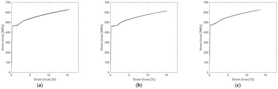 True stress—strain curves: (a) set 1; (b) set 2; (c) set 3.