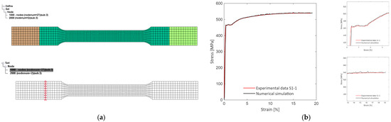 The implicit solver (*CONTROL_IMPLICIT) was used to solve the numerical model. The clamped ends were modeled as rigid bodies to impose both fixed and moving sections. To measure the force, a set of nodes located in the vicinity of the fixed end was constrained (*BOUNDARY_SPC). Two nodes on the calibrated section of the specimen, at the same distance as the extensometer opening, were selected to measure elongation during tensile loading. The simulation results (Figure 7b) were compared with the measured dataset to evaluate the performance of the implemented material model. A summary of the physical and mechanical properties of S460 is presented in Table 1.