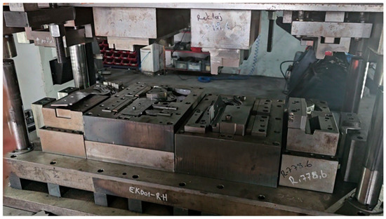 The manufacturing process for the assembly’s components involves a multi-step forming process. Figure 8 presents the press equipped with the dies for the forming operations. The initial shape presented in Figure 8 was previously cut from a blank sheet to match the final shape of the part.