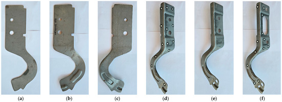 Figure 9 shows the part after each forming operation. The process begins with the workpiece being extracted from the blank sheet (Figure 9a), followed by four stages of forming (Figure 9b–e). To ensure accurate positioning of the part during forming, circular cutouts are required for the guidance pins (Figure 9a–e). The final stage involves trimming to obtain the finished part (Figure 9f).