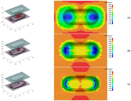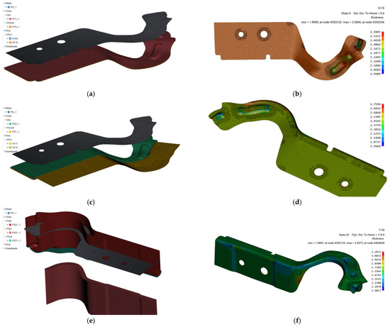 Forming set-ups for numerical simulation: (a) stage I tooling; (b) stage I—thickness distribution; (c) stage II tooling; (d) stage II—thickness distribution; (e) stage III tooling; (f) stage III—thickness distribution.