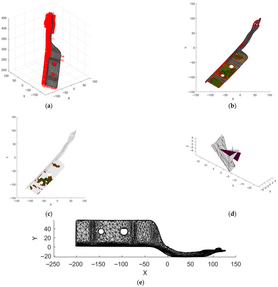 Geometrical operations (dimensions are represented in ): (a) normals; (b) definition of triangles’ sets; (c) reference set for alignment; (d) local vs. global coordinate systems; (e) aligned model.