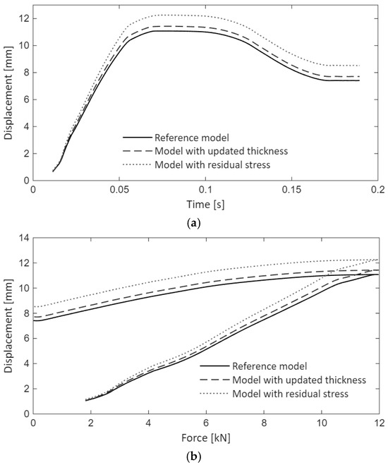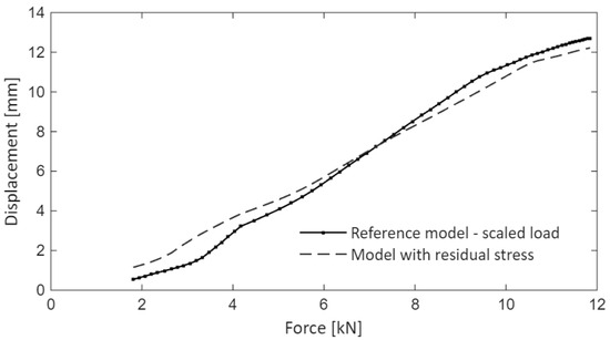 Simulation results (displacement at the load entry). Model with residual stresses vs. scaled model.