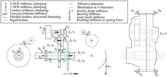 Topology of the holistic multibody dynamic model revealing the interactions of shafts, bearings, gears, freewheels, and housing.