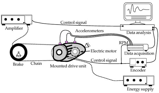 A computer performs the data analysis and controls the input parameters for the data acquisition module, the drive unit, and the magnetic powder brake. The drive unit’s control is internally governed. This is why an encoder is required to insert the input parameters, such as speed over time, and to receive the drive unit’s output signals. The data acquisition module captures the drive unit’s revolutions per minute (rpm) as a reference signal and has an internal decoder. The acceleration sensors measure the drive unit’s dynamic (surface) accelerations, whose signals are also recorded by the data acquisition module. The drive unit’s electric motor is powered separately via an energy source. The magnetic powder brake generates its braking torque through friction between a rotor and a stator using ferromagnetic powder. The amplifier and the degree of resulting friction indirectly control its torque magnitude. A bicycle chain connects the brake to the drive unit, which is mounted on a test rig.