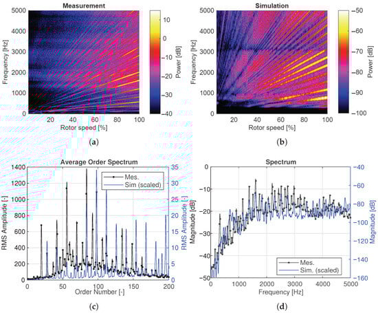 Figure 5a,b illustrates the Campbell plot from measurement and simulation. At a similar speed and frequency scaling, the amplitude (power in dB) is significantly lower in the simulation (approximately 5 dB compared to −60 dB for particular amplitudes). This could indicate that the simulation model is too stiff, as a lower structural stiffness would allow for larger vibration amplitudes due to increased displacements under the same excitation forces. Since the housing and its fixation to the frame are not examined in detail, this should be addressed in future investigations. In both cases, the orders increase, and resonances are crossed. A detailed visual comparison is not possible at this resolution using the Campbell plot. However, it proves that the simulation runs stably without convergence issues since no numerical artifacts are apparent, which most likely appear in the acceleration response.