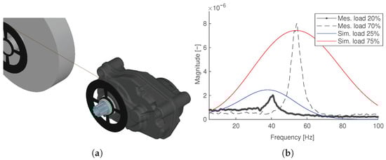 When comparing the resonances in Figure 7b, it becomes evident that the proportional relation between simulation and measurement is approximately similar. The wider shape of the curve from the simulation is linked to the resolution of the time discretisation, but may additionally come from further interference. Moreover, the load-dependent behaviour is visible, since the resonance frequency increases with increasing load. This is due to the load-dependent stiffness, which increases together with the applied load. Since the resonances match qualitatively between simulation and measurement, this indicates the validity of the simulation. Moreover, the pure presence of this mode covers the assumptions by Section 2.3 referring to the system’s mass momentum of inertia in Equation (20) and stiffness in Equation (24), which act on the rotor shaft on the system level.