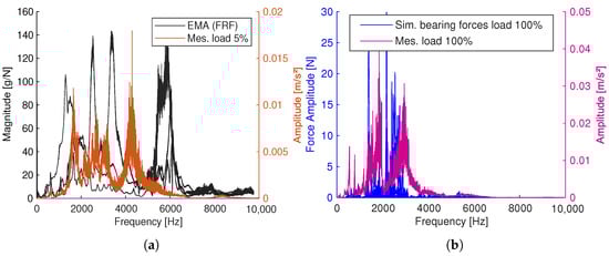 Figure 8a shows the comparison in the frequency domain from the EMA and the frequency spectrum determined over a ramp-up under low torque. For the EMA, this is carried out with the drivetrain rotationally constrained in order to enable a rough comparison, as the contacts are thereby locked. Since this is associated with a low preload, the ramp up is likewise considered at low torque. A similar comparison is conducted for simulation and measurement, but at high torque and solely for a ramp-up, since an EMA is not feasible in the given setup for high torque. The simulation takes the bearing forces into account since these best possibly indicate the excitation of the structure, whereas the acceleration amplitude is considered for the measurement (see Figure 8b).