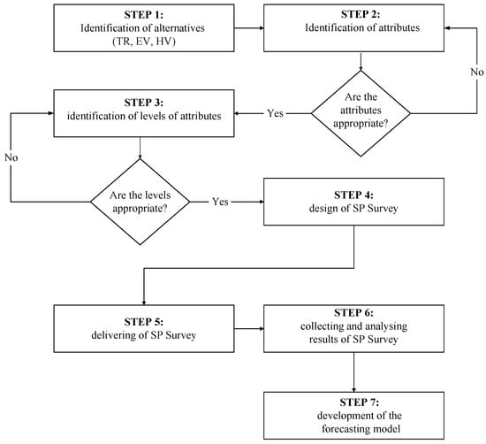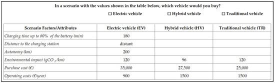 - stated preference (SP) section; this section presents nine hypothetical scenarios, each describing the three identified vehicle alternatives (electric, hybrid, and internal combustion engine); respondents are asked to select their preferred vehicle in each scenario; the alternatives are characterised by specific attributes (or factors), whose values vary across the scenarios; the considered factors are those specified in the section Identification of alternatives and attributes; these attributes allow analyst the estimation of the relative importance of each factor in simulating the respondents’ vehicle choice.