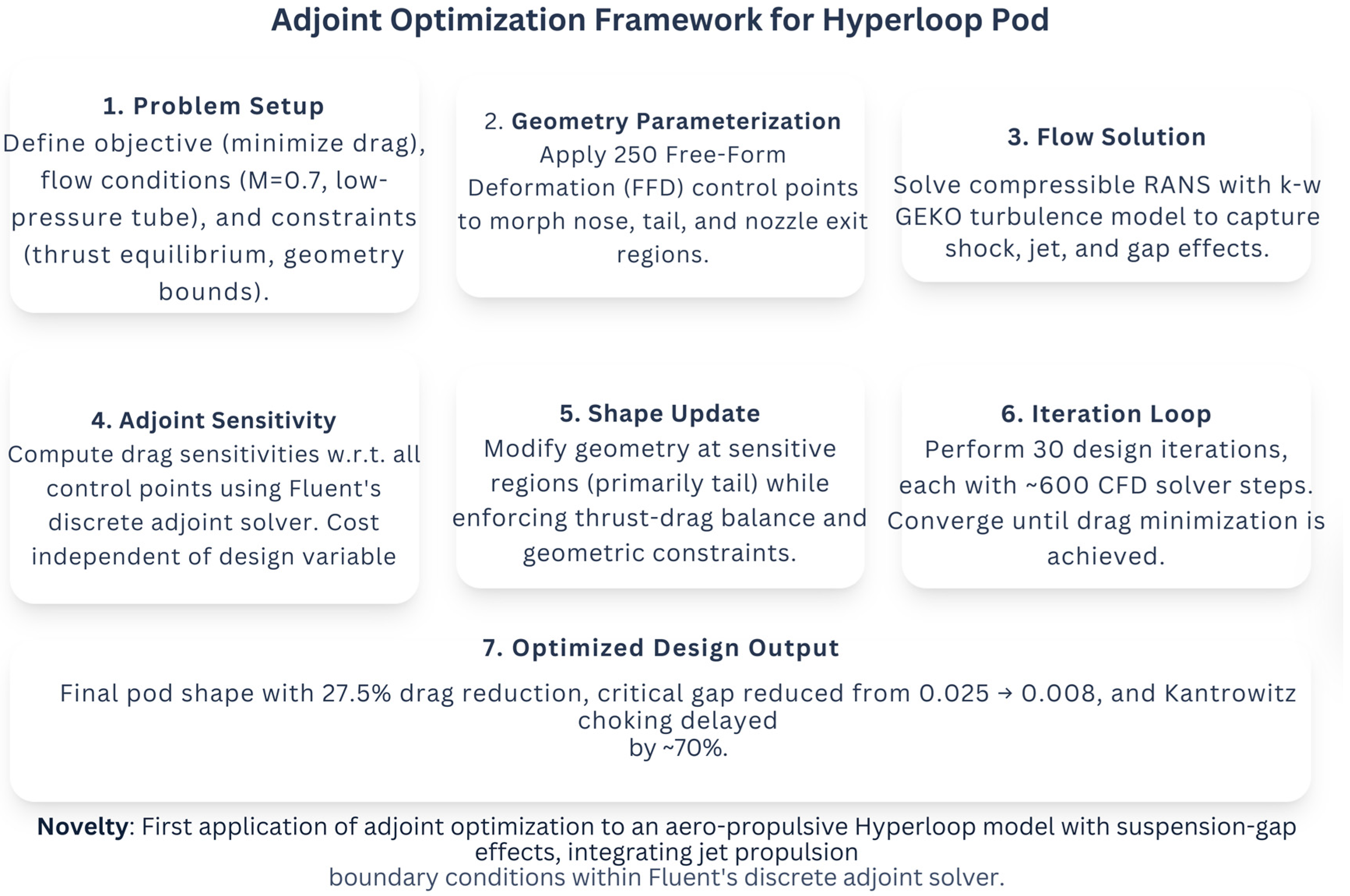 - Gap-aware optimization: To our knowledge, the first adjoint optimization of a Hyperloop pod that explicitly targets gap-induced choking and wall–jet interactions in a full pod–tube model.