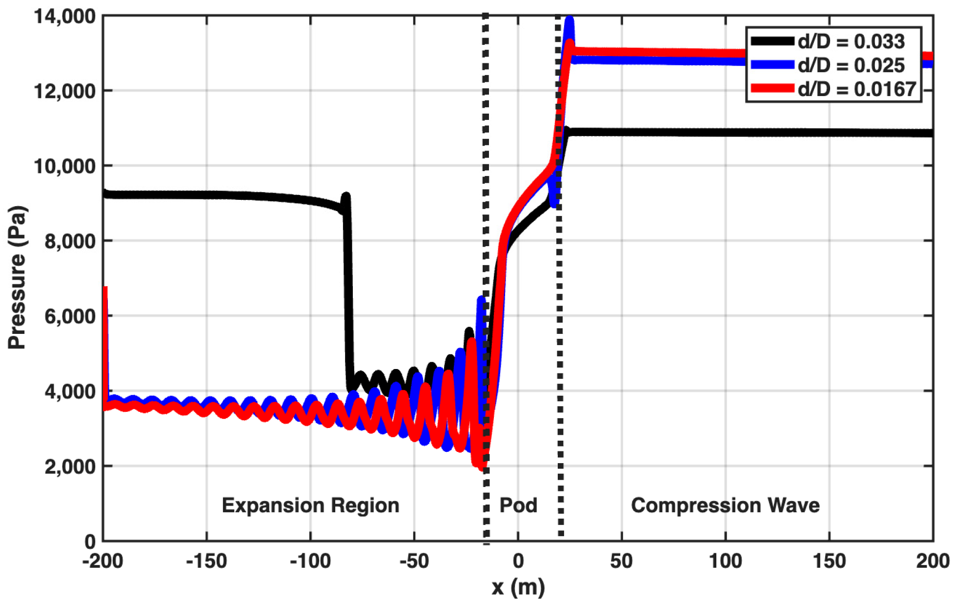 - Design rule-of-thumb: For transonic cruise at 10 kPa, standard pods must maintain a clearance-to-diameter ratio (d/D) above 0.025 to prevent choked flow. An optimized pod, however, remains stable down to a ratio of approximately 0.008. This lower limit is a practical design target, as it accommodates the millimeter-level gaps used in magnetic levitation systems.