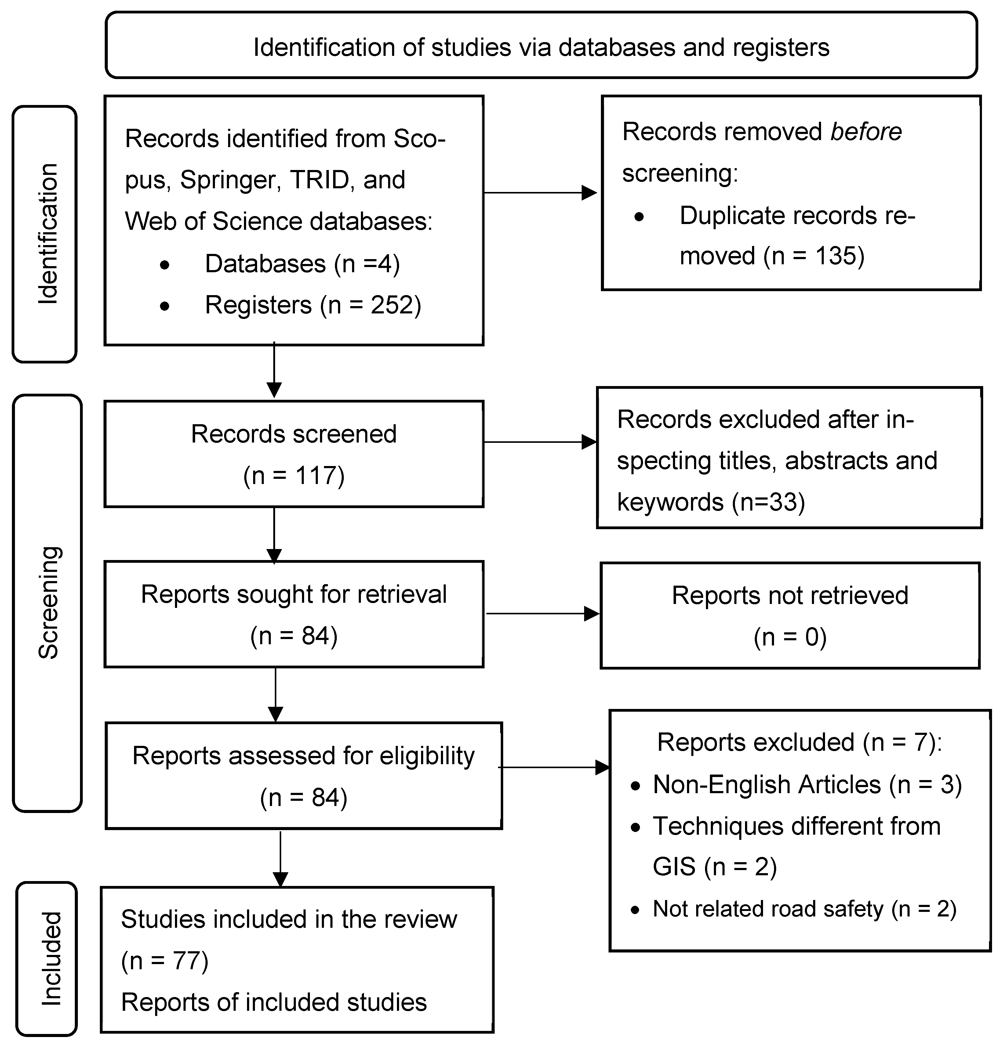 A comprehensive literature search was performed on road traffic crash analysis. Relevant studies have been collected from Scopus, Springer, TRID, and Web of Science databases. Carefully selected keywords, including GIS, accident analysis, and road accident, were used to identify pertinent journals. The screening pipeline depends on the desired presentation Items for the PRISMA approach, as illustrated in Figure 1. A total of 252 papers matching the search criteria were identified across both databases. After removing duplicate documents, 117 articles have been identified for primary evaluation. Depending on keywords found in the topics, abstracts, and keywords, 84 articles were selected for the first round of assessment.