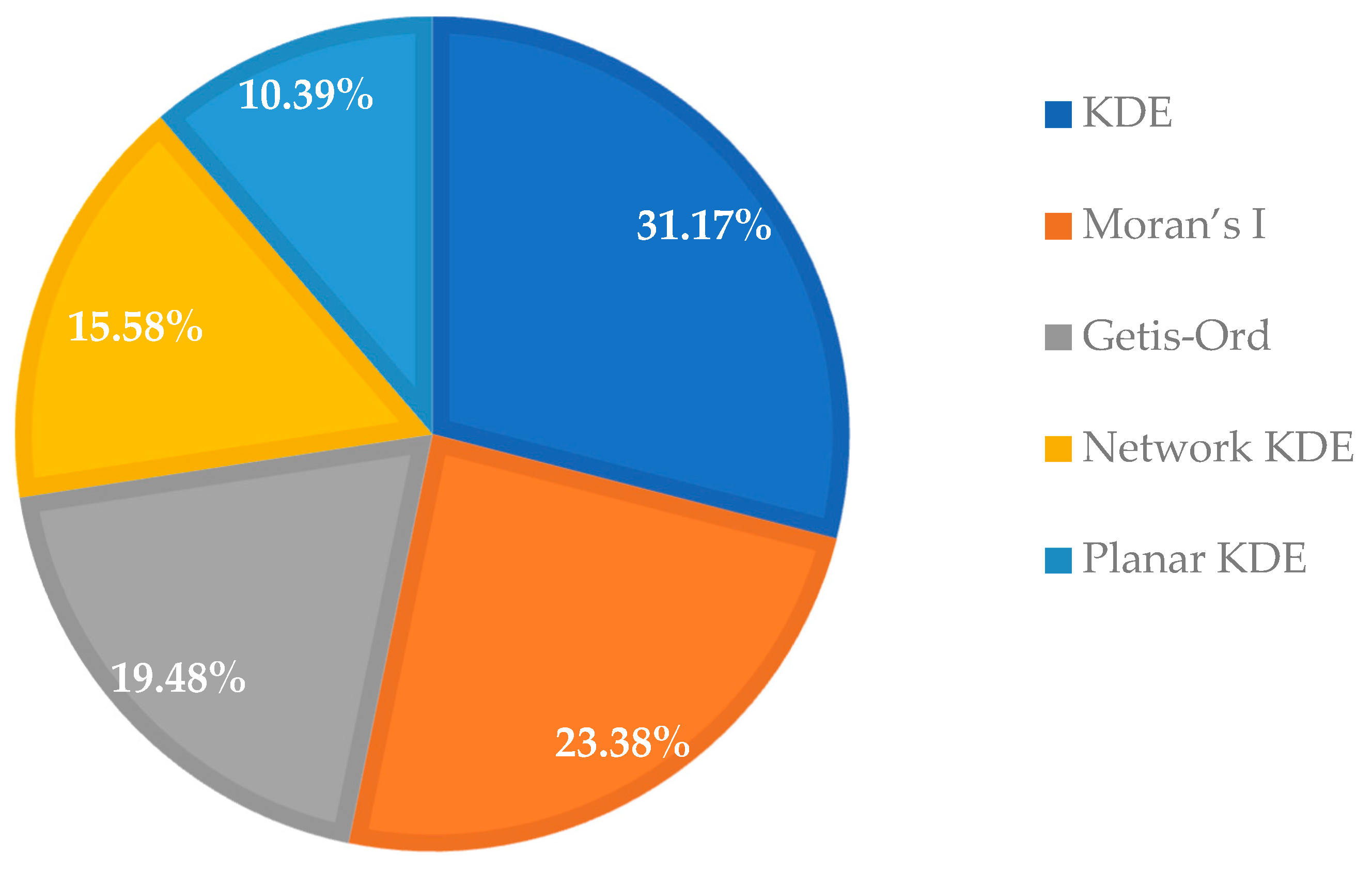 A comprehensive review of current literature was conducted to obtain accurate and reliable findings. Researchers primarily employed GIS tools, including KDE, Moran’s I, Getis-Ord, and the spNetwork package, in their studies. As shown in Figure 3, the adoption rates of various GIS techniques indicate that KDE and Moran’s I were the most frequently applied, with usage rates of 31.17% and 23.38%, respectively. Getis-Ord accounted for 19.48% of the applications, while Network KDE techniques represented 15.58%. Notably, planar KDE had the lowest adoption rate at just 10.39%.