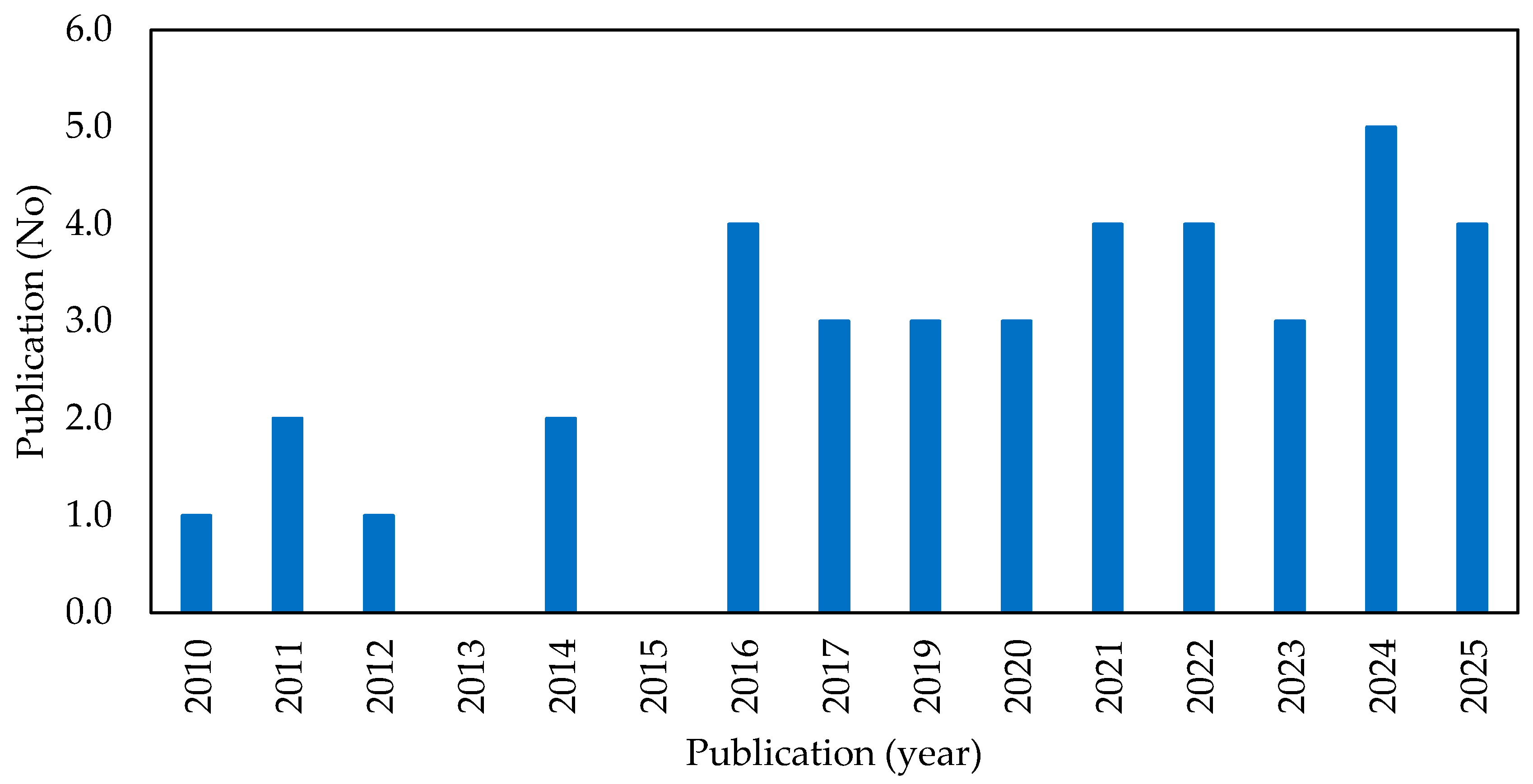 Additionally, Table 4 indicates a spatial evaluation technique scattered across 77 assessed investigations. KDE was applied 24 times, while Getis-Ord and Moran’s I were utilized 15 and 18 times, respectively, across the reviewed literature. Thus, it is evident that Moran’s I and KDE techniques were more commonly employed by GIS users and are best applied in combination. Figure 3 demonstrates the annual distribution of publications related to GIS applications in traffic accident analysis from 2010 to 2025. The trend shown in the figure demonstrates a gradual but consistent increase in research activity over the 15 years, illustrating the growing academic and practical interest in utilizing GIS for analyzing and managing road traffic accidents.