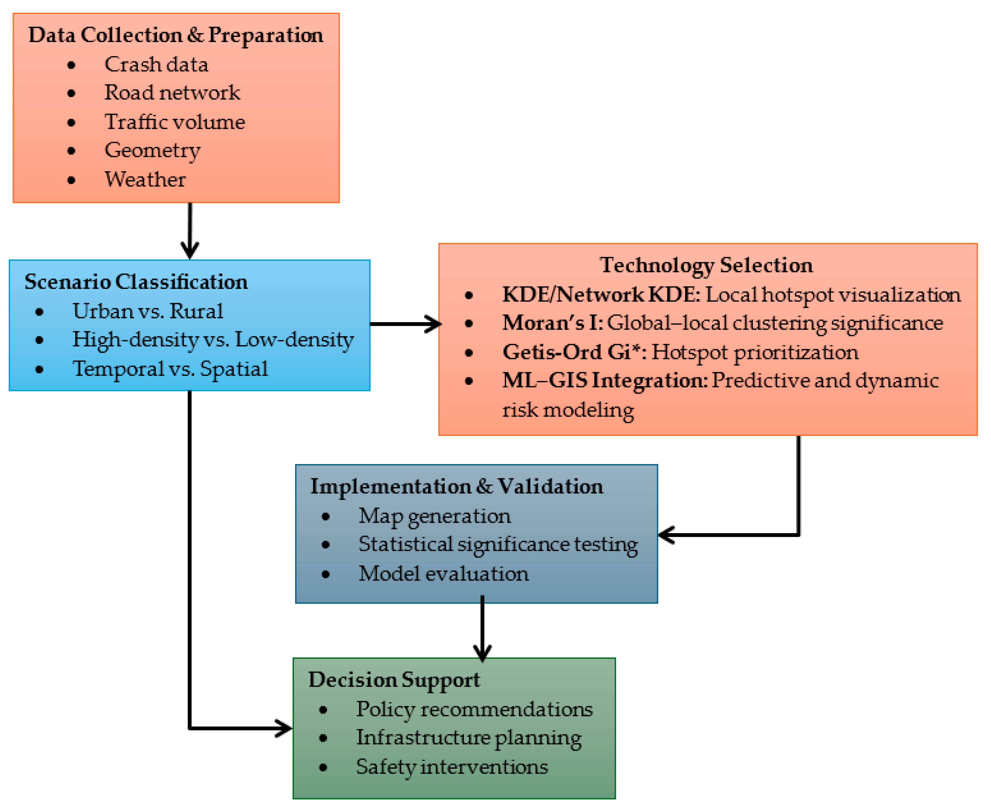 The choice of GIS techniques for road traffic crash analysis is influenced by the study’s objectives, data characteristics, and the spatial scale of investigation. Drawing from the reviewed literature, a structured framework is proposed to assist scholars and practitioners in selecting the most appropriate GIS approach for different analytical scenarios, as shown in Figure 5. For detecting hotspots in dense urban road networks, KDE and Network KDE are the most suitable techniques, as they effectively reveal localized clusters of crashes and visualize their spatial intensity along intricate road systems. In contrast, Moran’s I, both in its Global and Local forms, is best applied for assessing spatial autocorrelation and regional risk patterns, providing statistical insight into high and low risk zones. When prioritizing intervention areas, the Getis-Ord Gi* method serves as a powerful tool to identify statistically significant hot and cold spots, guiding decision-makers in allocating safety resources efficiently. Moreover, for advanced scenario testing and predictive modeling, integrating GIS with Machine Learning and Artificial Intelligence algorithms such as Random Forest and XGBoost enhances analytical precision, enabling simulation of intervention outcomes and real-time prediction of crash risks. This framework not only bridges the methodological gap between spatial analysis and decision-making but also supports the development of data-driven strategies for improving road safety.