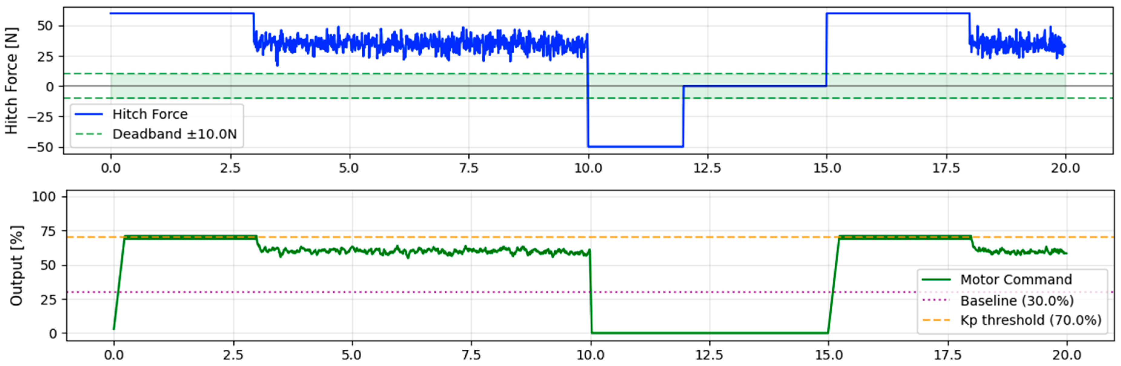 | // Variable definition float Maximum_rate = 15f; // Max change of output per cycle float Previous_Output_value = 0.0f; // Last throttle value // PID Parameters float setpoint = 0.0f; // Desired force = 0 float Kp_low = 0.8f; // Proportional gain low speed region float Kp_high = 0.4f; // Proportional gain near maximum speed float Ki = 0.05f; // Integral gain float Kd = 0.3f; // Derivative gain // Threshold for adaptive control float Motor_Command_threshold = 80.0f; // Integral limits for anti-windup #define INTEGRAL_MAX 200.0f #define INTEGRAL_MIN -200.0f // PID State variables float integral = 0.0f; float previous_error = 0.0f; |