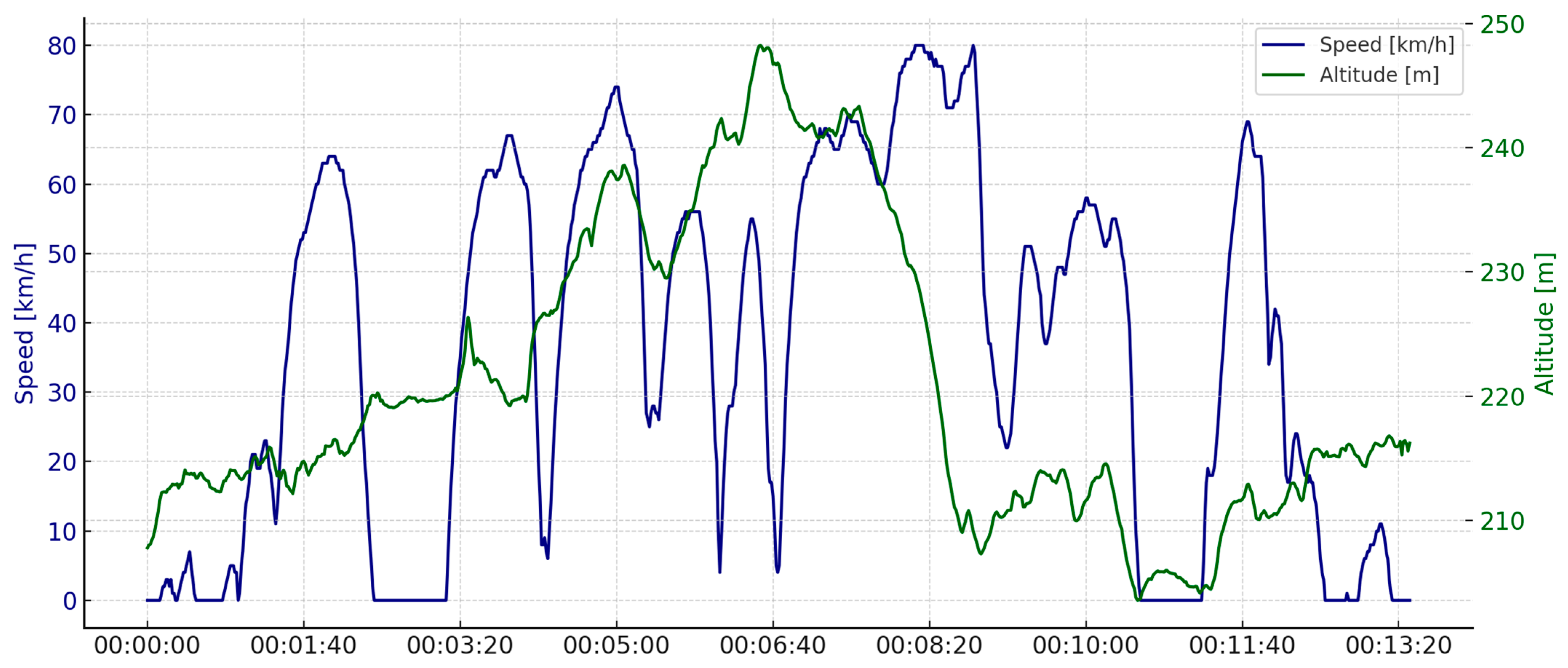 - Identifying the influence of topography—thanks to the altitude parameter, it is possible to separate driving on hills from driving on flat terrain, even at similar speeds and power levels [29]. This allows for analyzing how changes in terrain affect energy consumption and recuperation frequency.