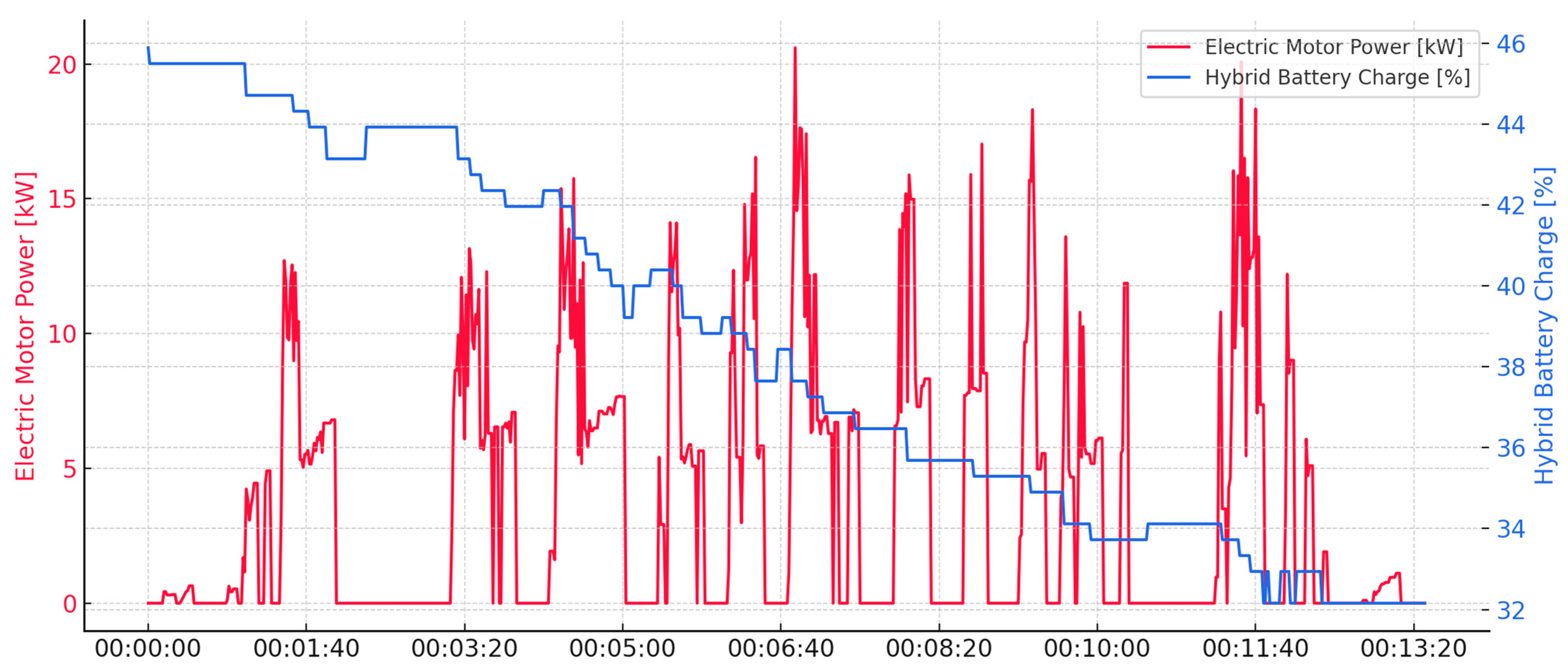 - Identify sections where SOC stabilizes or increases, which may indirectly indicate recuperation activity or drive power reduction to save energy. 3. Detecting changes in the PHEV control strategy—during low SOC phases, the system can further reduce electric power and switch to fuel-efficient modes more frequently, even under similar speed and acceleration conditions.