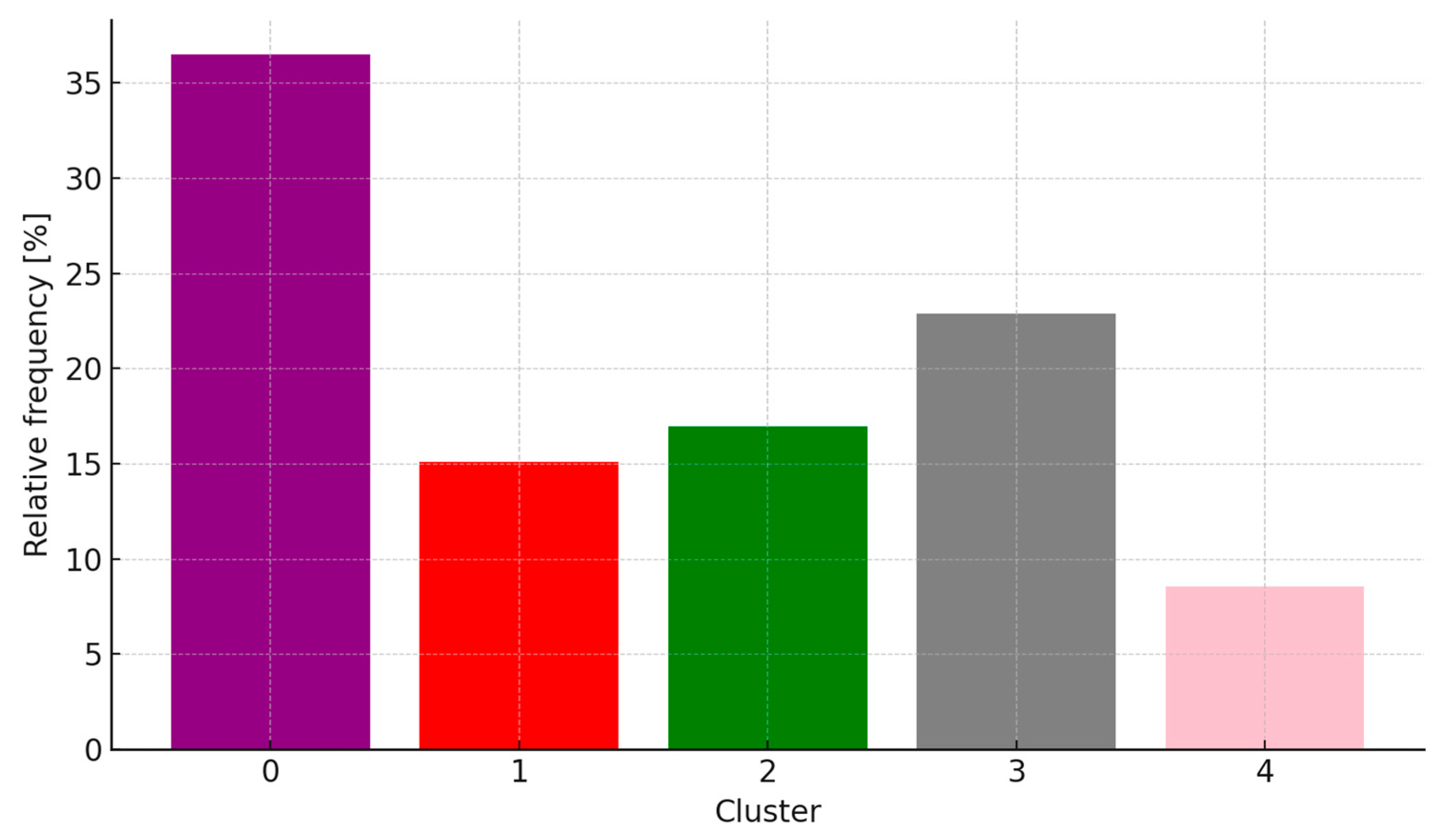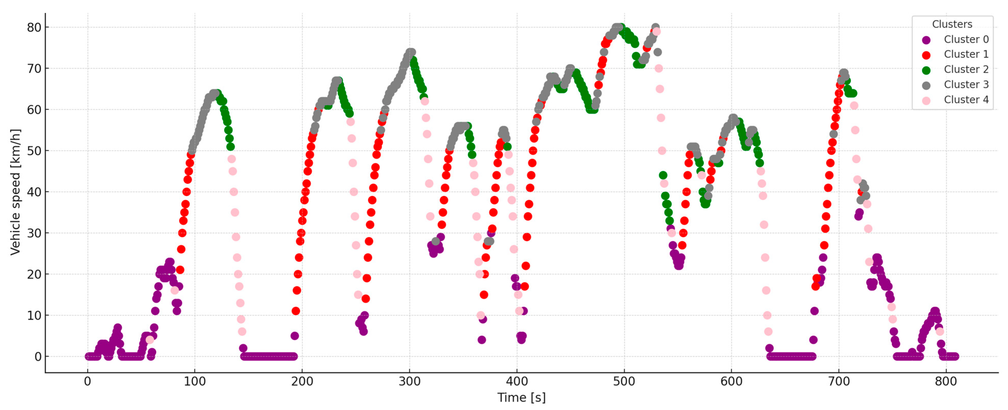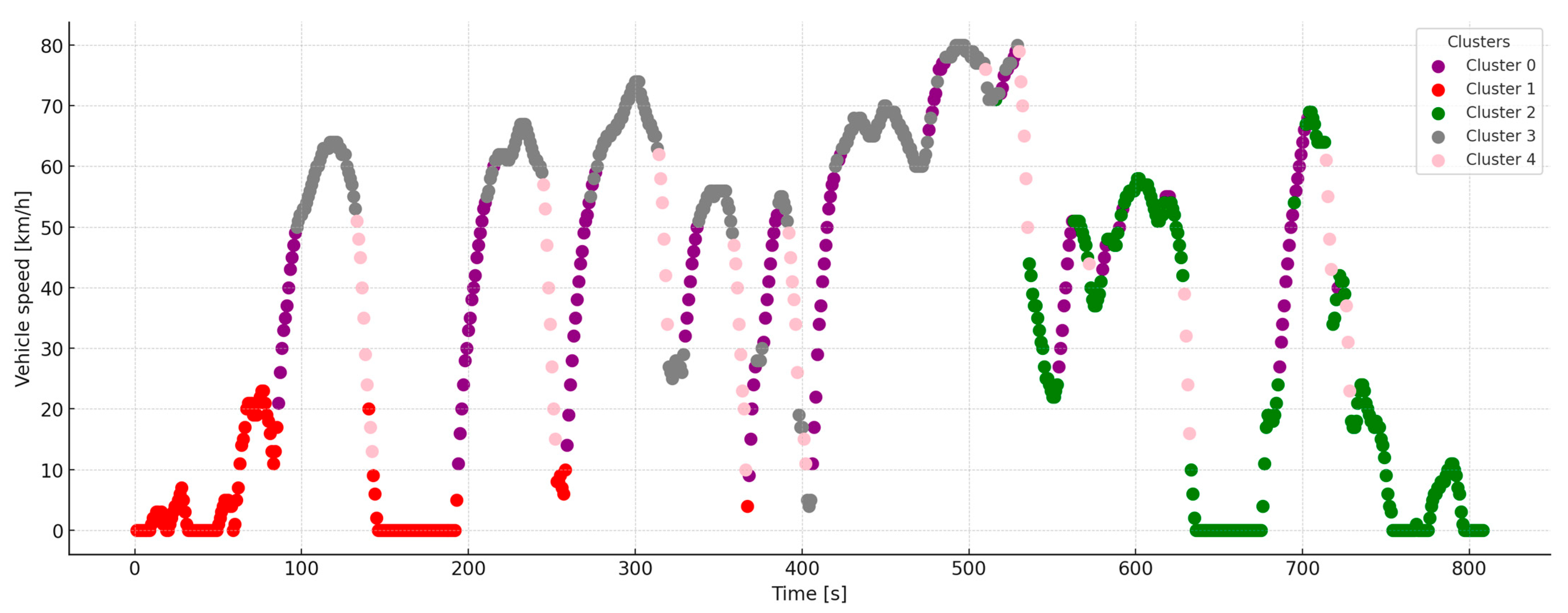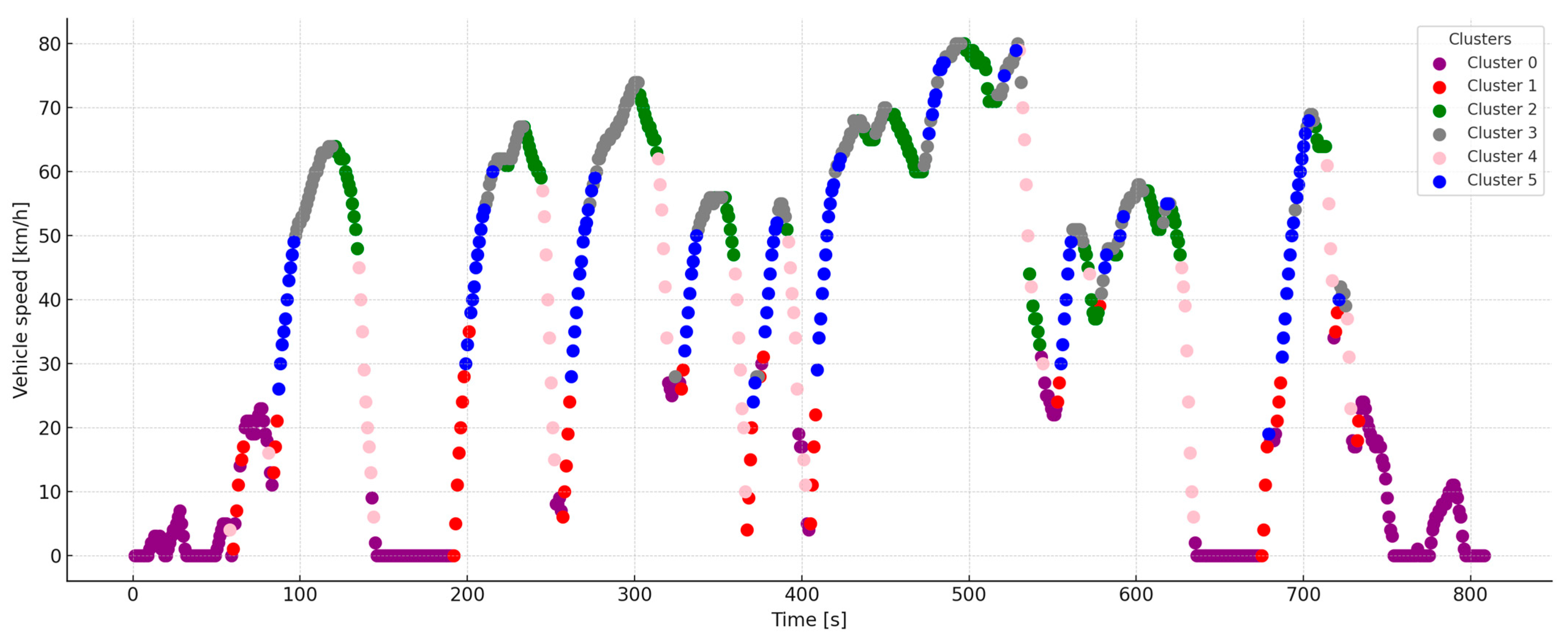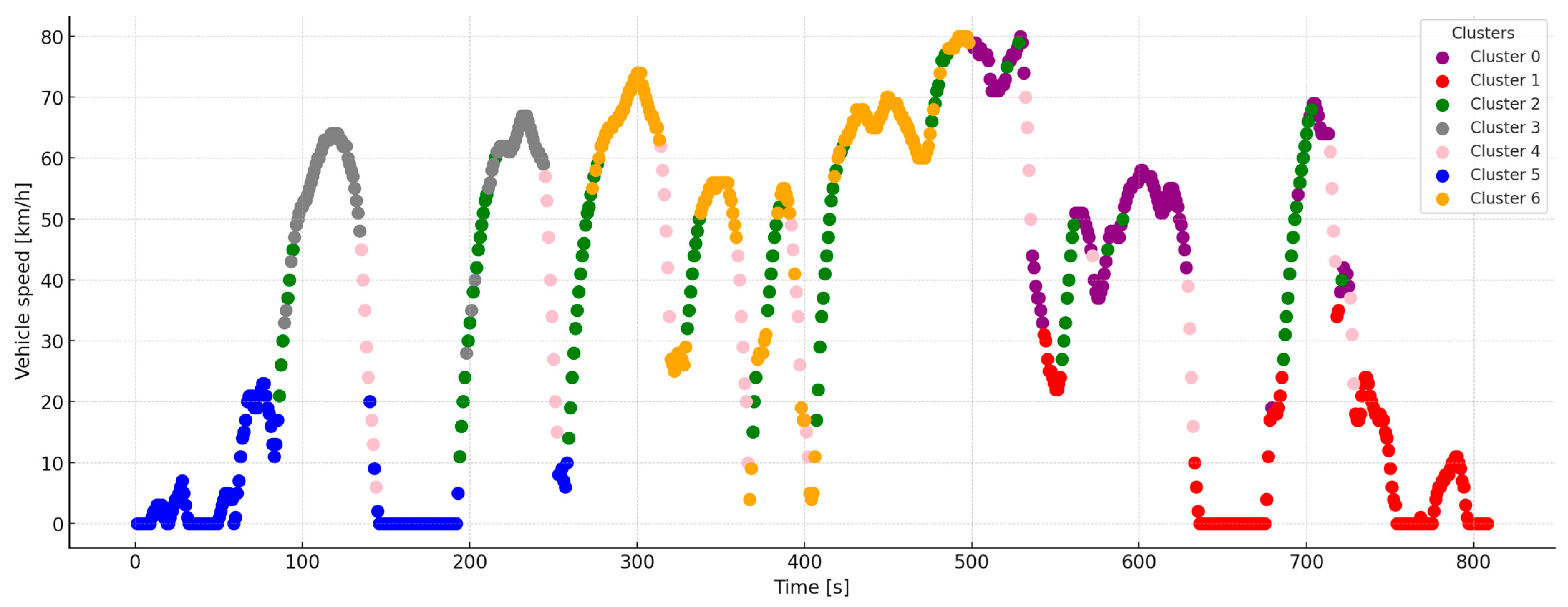 - Cluster 0 (purple)—14.9%: A typical section of a smooth start from a traffic light, driving in a traffic jam, or slowly rolling through urban zones at 30 km/h.