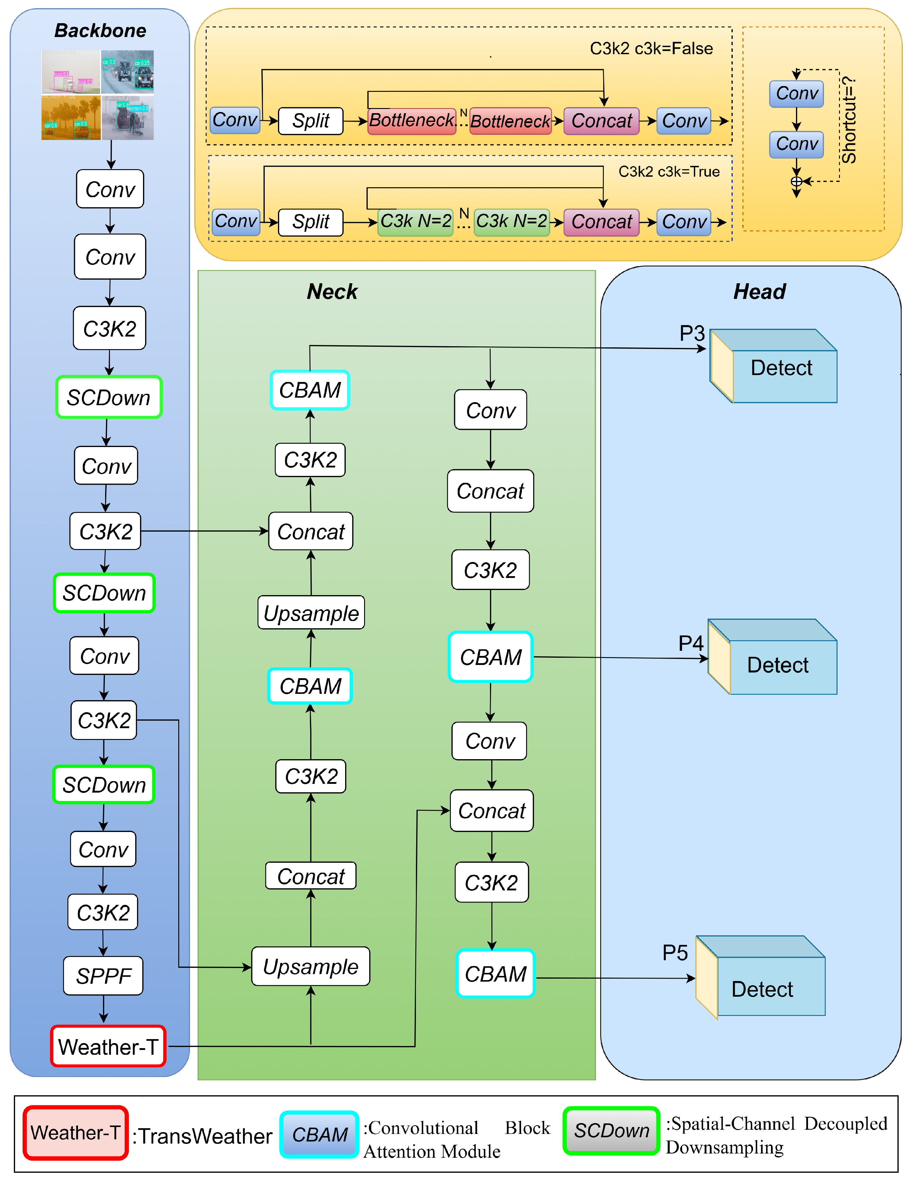 To improve feature extraction for objects degraded or occluded by rain, snow, fog, and sandstorms, we replace the self-attention and feed-forward network (FFN) components of the PSA block within the C2PSA module at the final stage of the YOLOv11 backbone with the TransWeather Block [