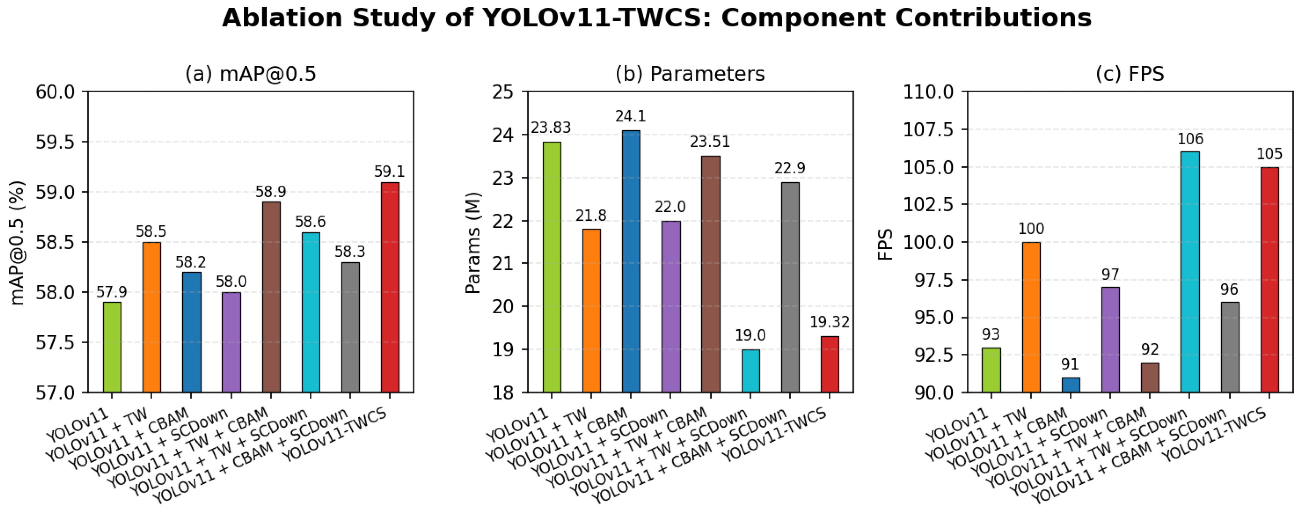| YOLOv11-TWCS (Full) | ✓ | ✓ | ✓ | ✓ | 59.1 | 36.1 | 19.32 | 105 |