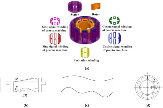 The design of the reluctance resolver mainly includes the design work of the stator, rotor and winding. Normally, the stator design of the reluctance resolver is similar to that of the motor, consisting of stator teeth, stator slots, stator yokes, etc. Some radial reluctance resolvers and axial reluctance resolvers are provided with an axial slot structure in the axial direction of stator [4]. Ref. [5] uses the tooth pairing method to change the stator tooth shape, which can achieve higher measurement accuracy. The reluctance resolvers may have various design structures of rotor according to different requirements, including wound rotor, radial rotor, axial rotor, and other structures [6]. In Ref. [7], a slant-ring type rotor structure is used in this paper, which cooperates with the cylindrical stator structure to achieve the alternate change of the positive and cosine signals of the output signal. The winding of reluctance resolvers is used for signal input and output, and has various winding forms [8,9,10]. Ref. [11] designed a novel winding arrangement, which simplified the manufacturing process of wound rotor (WR) rotary transformers and improved their accuracy. Ref. [12] proposed a design concept of multi-turn coils, which solved the problem of losing absolute position information. And the sine and cosine winding functions were proposed, which enhanced the reliability of the design. After the structural design of the resolver, parameter adjustment needs to be carried out through characteristic calculation and output signal analysis. It can be seen that research object of existing literature is generally a single-channel structure, which can not achieve absolute measuring position, the minority of dual-channel structures are also realized by multi-functional windings. In this paper, the design concept of dual-channel will be realized by different magnetic belt functions of rotor, which is different from the above literature, and has a simple manufacturing process. It can guarantee the purpose of absolute positioning and high measurement accuracy. The calculation of inductance is an important part of the design of reluctance resolvers, used to measure the performance of reluctance resolvers. The structural parameters directly affect the variation law of inductance [13]. Ref. [14] conducted winding design and configuration through the winding function method, providing support for the design of new resolvers. This winding design concept provides new ideas for the design and analysis of different resolvers. The rotational transformer proposed in Ref. [15] is modeled using a three-dimensional improved winding function method, which combines numerical integration techniques to consider the slot and end effects in the model. The priority assessment is given to the performance evaluation of resolvers. After the structural design is completed, the correctness of the sine and cosine signal outputs can be verified through finite element simulation analysis to meet the requirements of position signal measurement [16]. Ref. [17] employs an analytical modeling approach based on a magnetic equivalent circuit to investigate the output signal of the variable reluctance (VR) resolver with ring winding arrangement. All simulations are carried out by using the time-stepping finite element analysis, and a satisfactory analysis of performance of VR resolver is obtained. In order to improve the measurement accuracy, it is necessary to optimize the analysis of magnetic reluctance type rotary transformer, further select the structural parameters, and find optimal parameters [18,19]. On this basis, it is necessary to measure the error of the reluctance resolver through experiments, so as to verify the correctness of the reluctance resolver design [20]. In general, the radial reluctance resolver realizes the sinusoidal change of induced magnetic field by changing the air gap, and the axial reluctance resolver realizes the sinusoidal change of induced magnetic field by changing the coupling area. In this paper, a new type of reluctance structure is realized by changing the coupling area to form the sinusoidal change of radial magnetic field, which is a principle that has not appeared in the existing literature and is worth studying. Ref. [21] and Ref. [22] proposed a resolver with a slotless structure, which is worth drawing on in the design of resolvers. Ref. [23] proposed the field-reconstruction method, which provides certain assistance for the performance prediction of resolvers. Ref. [24] and Ref. [25] proposed the concept of direct current and alternating current hybrid excitation, which can solve the angle measurement of high-speed running motors. However, the switching between direct current and alternating current would make the design of resolver more complex, which is not the goal pursued by the design concept of this paper.