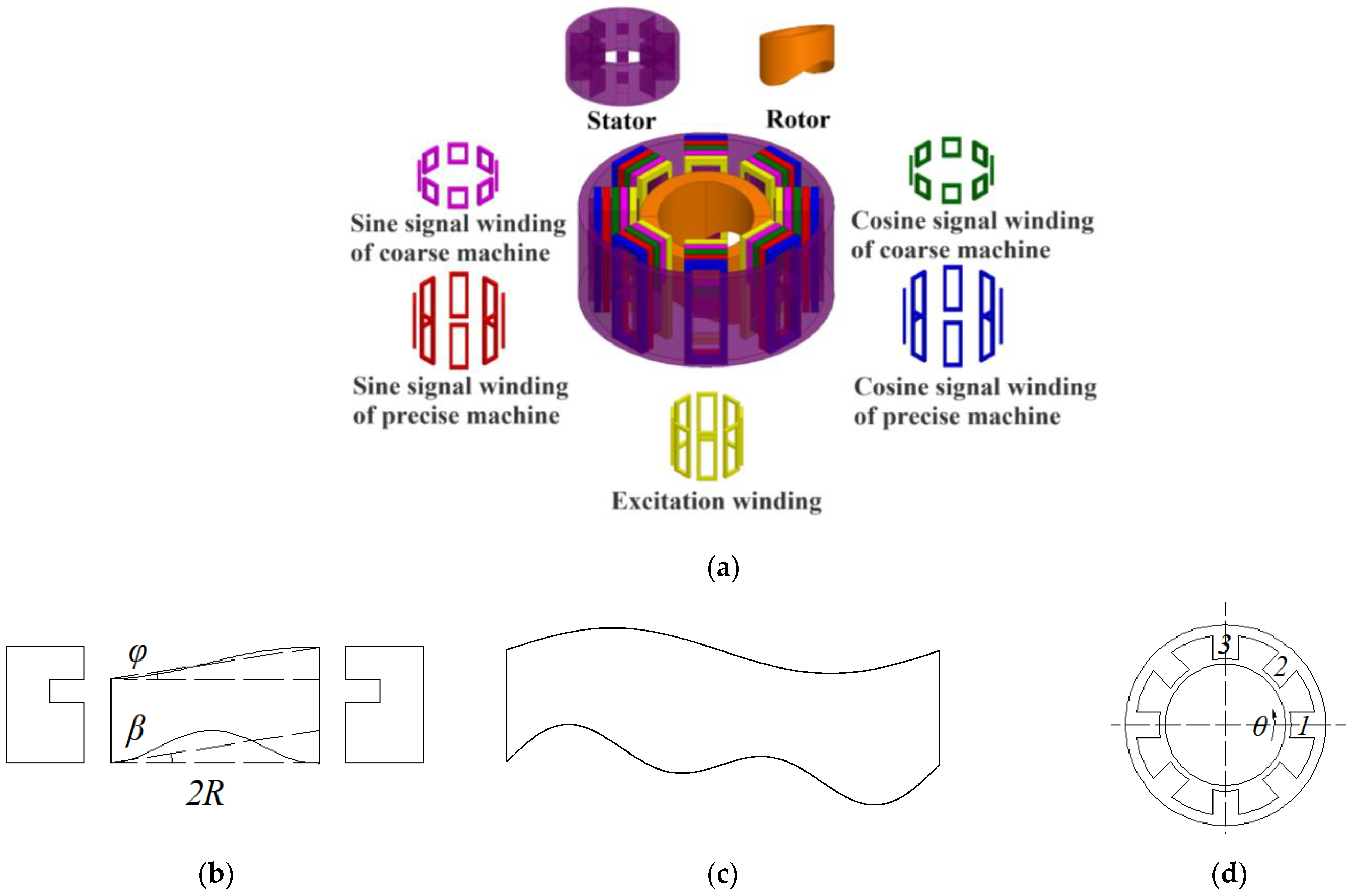 - Bahari, M.; Nasiri-Gheidari, Z.; Tootoonchian, F. Modeling, performance analyzing, and prototyping of variable reluctance resolver with toroidal winding. IEEE Sens. J. 2021, 21, 4425–4432. [Google Scholar] [CrossRef]
