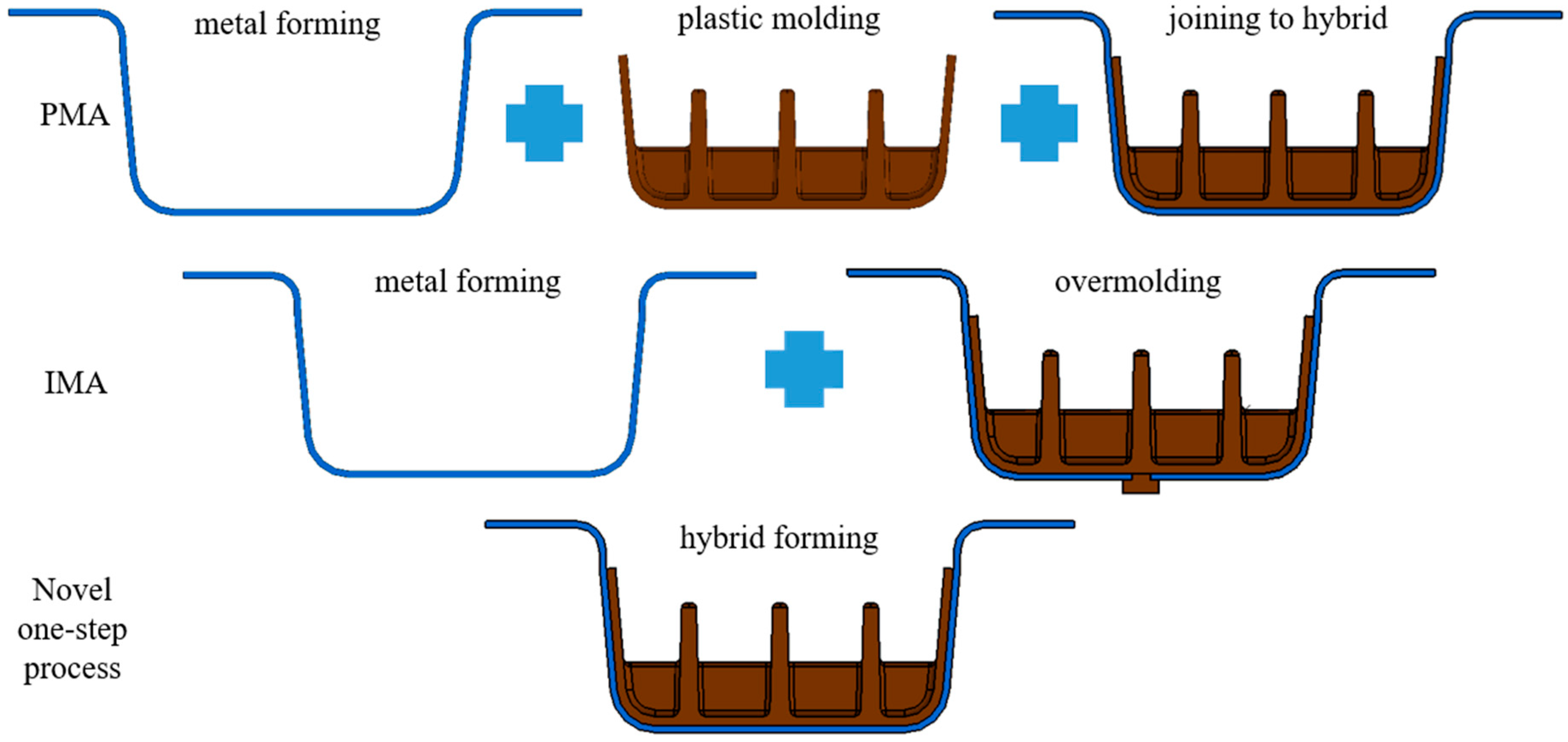 - Hopmann, C.; Schild, J.; Wurzbacher, S.; Tekkaya, A.E.; Hess, S. Combination technology of deep drawing and back-moulding for plastic/metal hybrid components. J. Polym. Eng. 2018, 38, 583–589. [Google Scholar] [CrossRef]